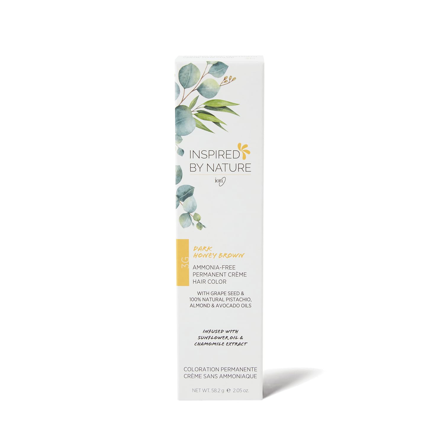 ion Inspired By Nature Permanent Hair Color Dark Honey Brown 3G, made from 100% naturallyderived polymers, cruelty free, vegan, PPD free, recyclable packaging, 2.05 oz