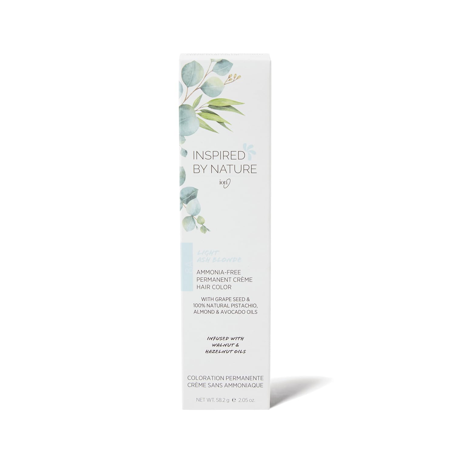 ion Inspired By Nature Permanent Hair Color Light Ash Blonde 8A, made from 100% naturallyderived polymers, cruelty free, vegan, PPD free, recyclable packaging, 2.05 oz