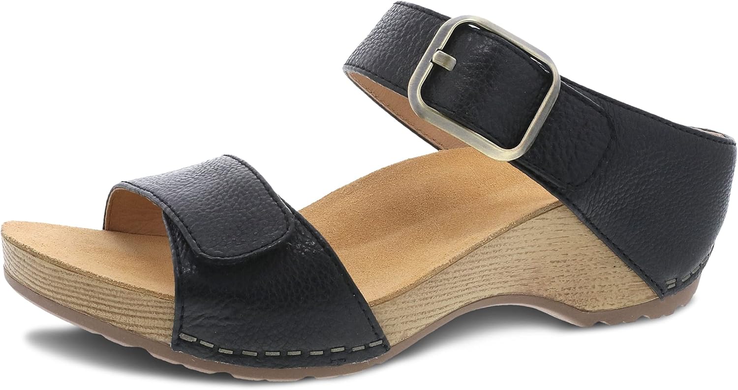 Dansko Tanya Slip-On Wedge Sandal for Women – Cushioned, Contoured Footbed for All-Day Comfort and Support – Hook & Loop Strap with Buckle Detail – Lightweight Rubber Outsole Tanya Black 5.5-6 M US